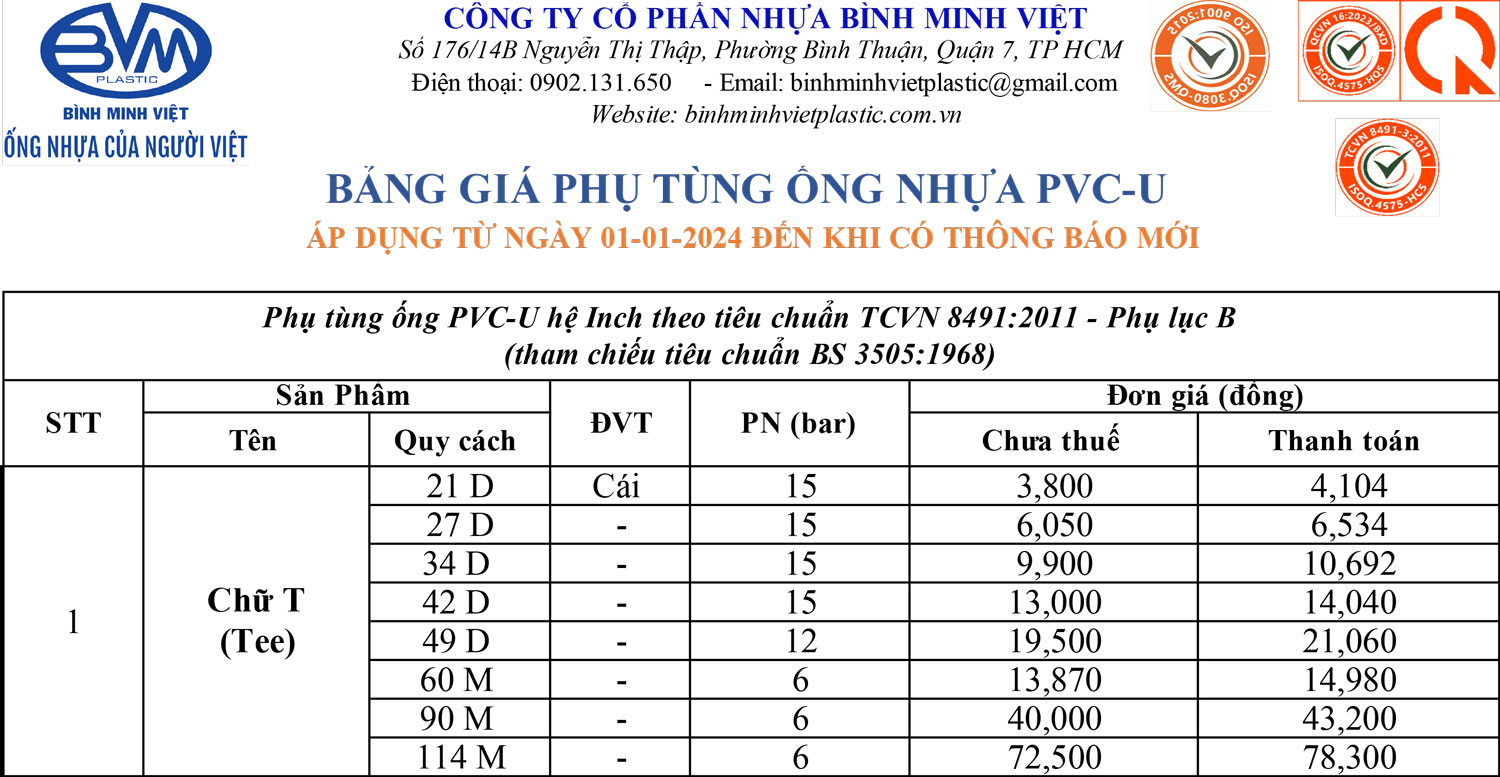 Tee Fitting from Binh Minh Viet is an essential component made from unplasticized PVC (PVC-U), commonly used in water supply and drainage systems. This fitting has a T-shape design and functions to connect three pipe sections, helping to direct and distribute flow within the piping system.