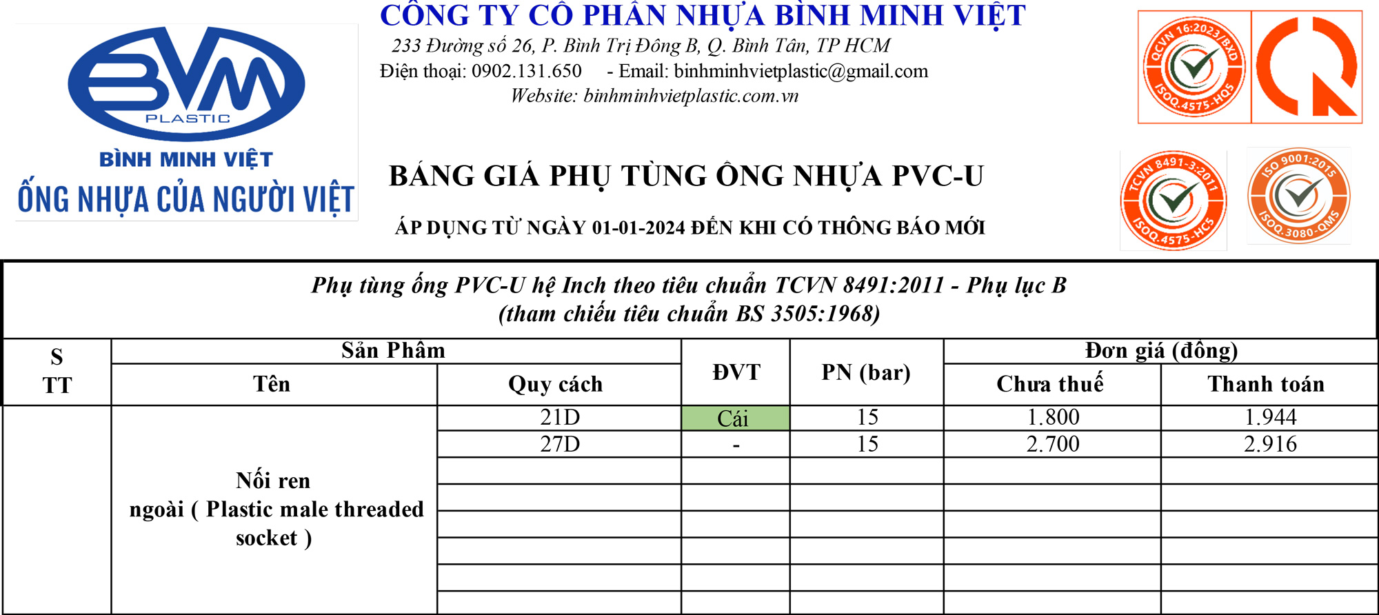 Plastic Male Threaded Binh Minh Viet – PVC-U Fittings