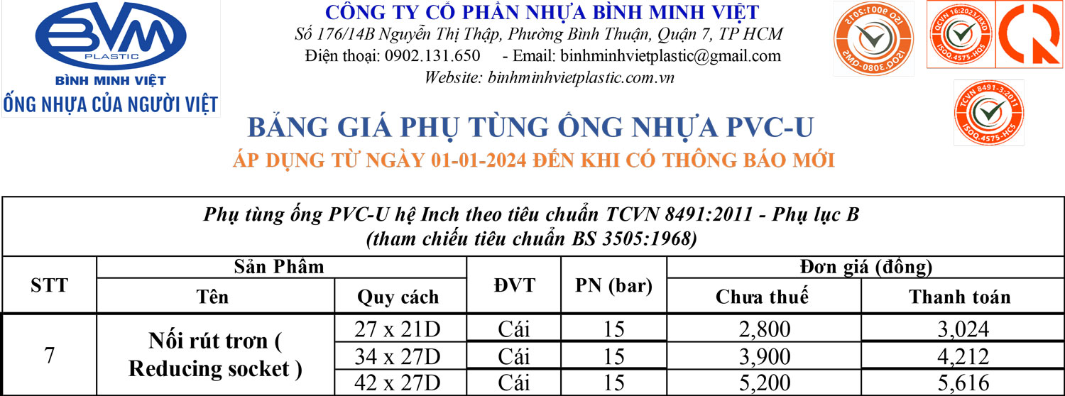 Reducing Socket from Binh Minh Viet is an essential fitting made from unplasticized PVC (PVC-U), commonly used in water supply and drainage systems. It functions to connect pipes of different sizes, while ensuring stable flow and efficient system operation.